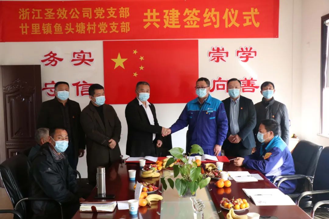 1月18日下午在衢江区廿里镇鱼头塘村文化礼堂举行了签约仪式,浙江圣效公司党支部书记洪国良、鱼头塘村党支部书记洪鸿根在《企村党支部共建联谊协议》上签字。